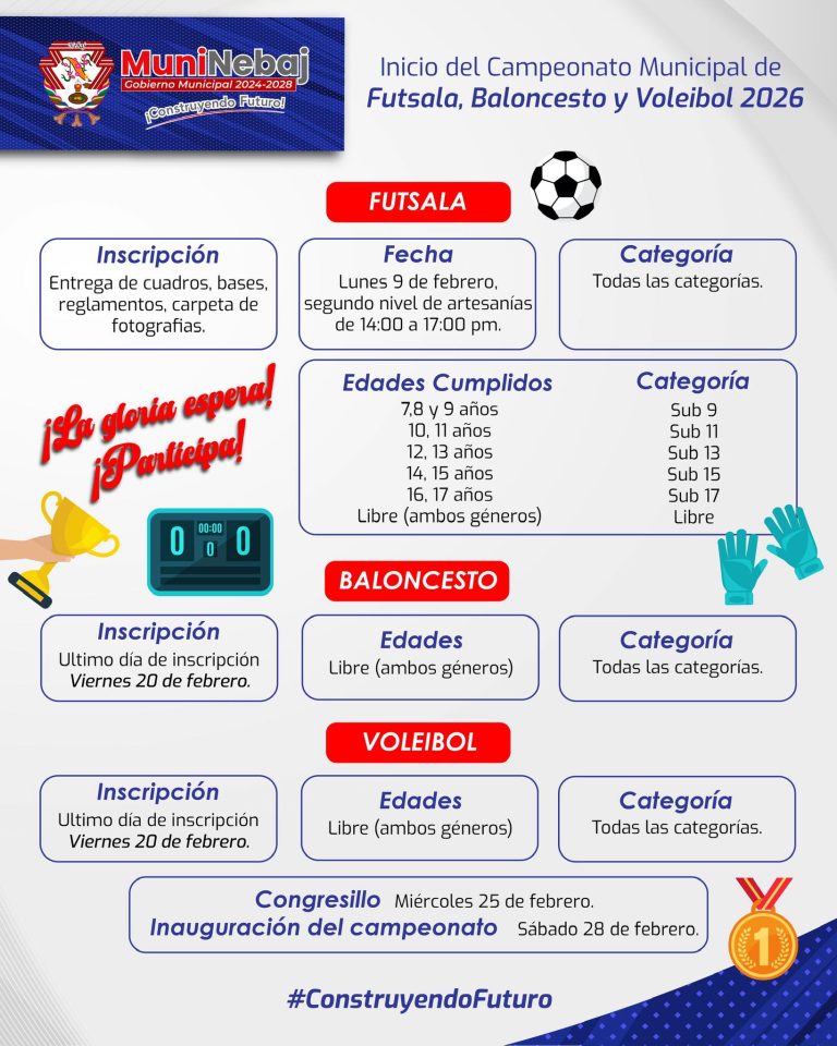 โDeporte para todosโ Les dejamos los detalles de las inscripciones para Futsala, Baloncesto y Voleibol 2026. ยกLa gloria espera! ยกParticipa!